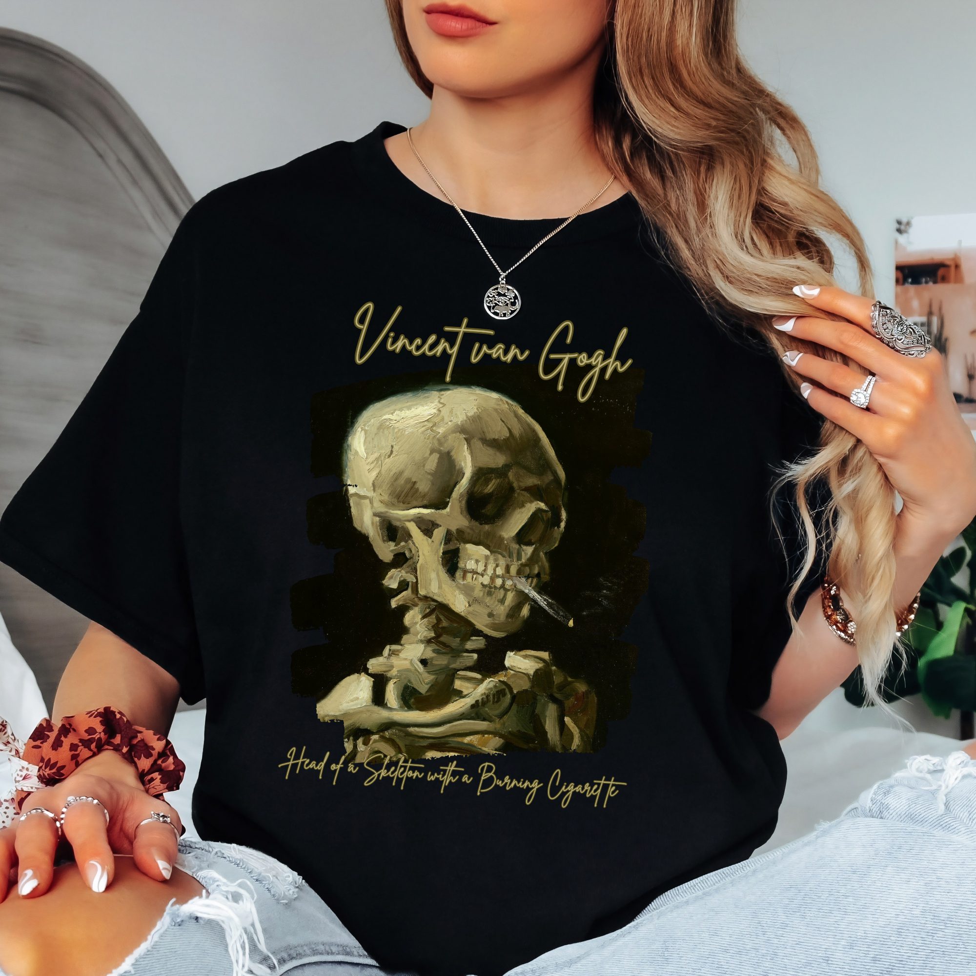Head of a Skeleton with a Burning Cigarette T-Shirt Vincent van Gogh Art Famous Dutch Artist Artsy Lovers Gift For Men and Women. This is an Artwear.me exclusive shirt, not found on the highstreet or sold by anyone else. This cozy, snuggly, 100% cotton shirt is super soft, lightweight and comfortable.