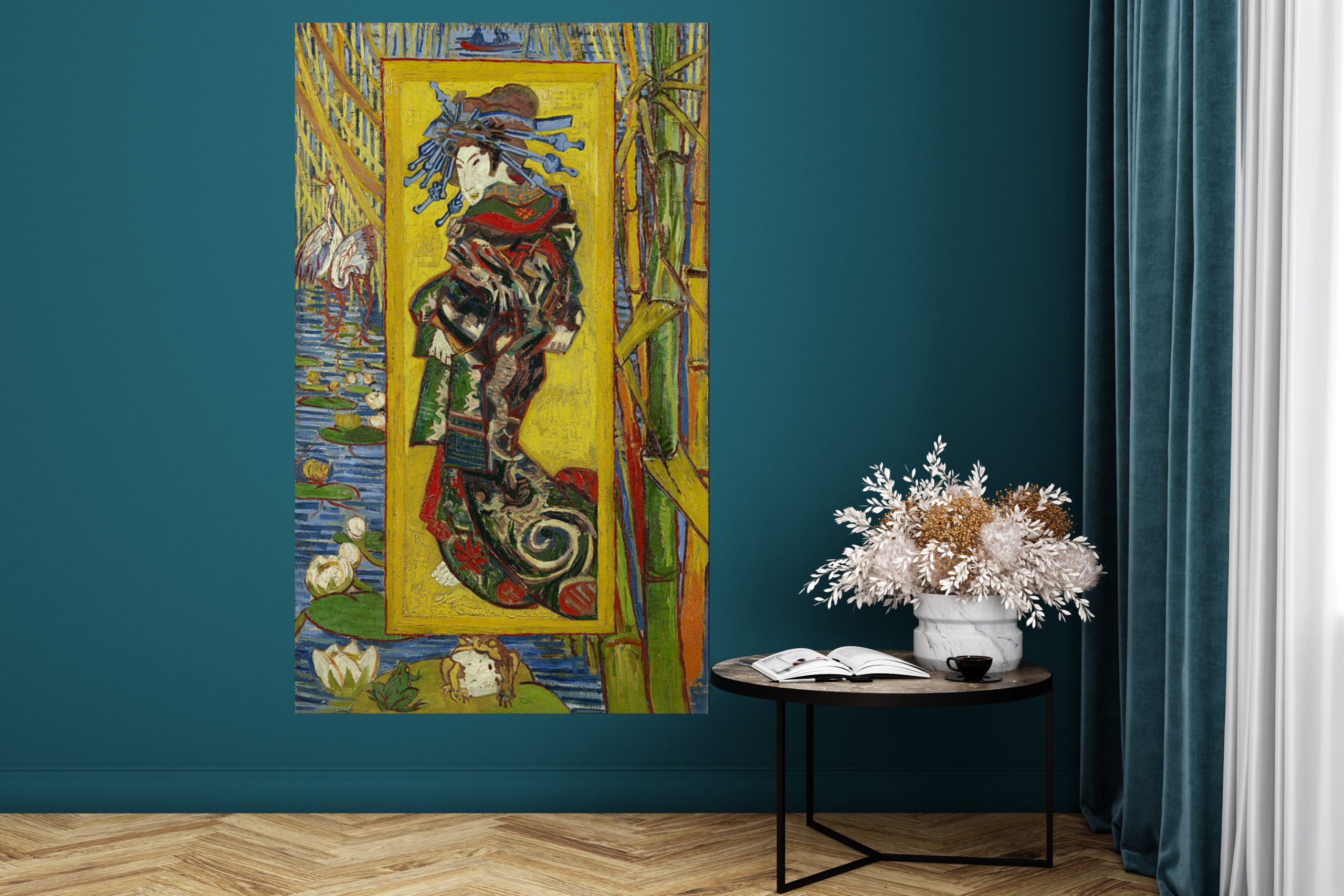 The source of the image is surprisingly humble. Van Gogh encountered a reproduction of a woodblock print by the Japanese artist Keisai Eisen on the cover of Paris Illustré, a popular magazine. Rather than simply copying it, he transformed it. He enlarged the figure dramatically, intensified the colors, and surrounded the courtesan with a vivid, symbolic landscape of frogs, cranes, and bamboo—motifs drawn from Japanese folklore and his own imagination.